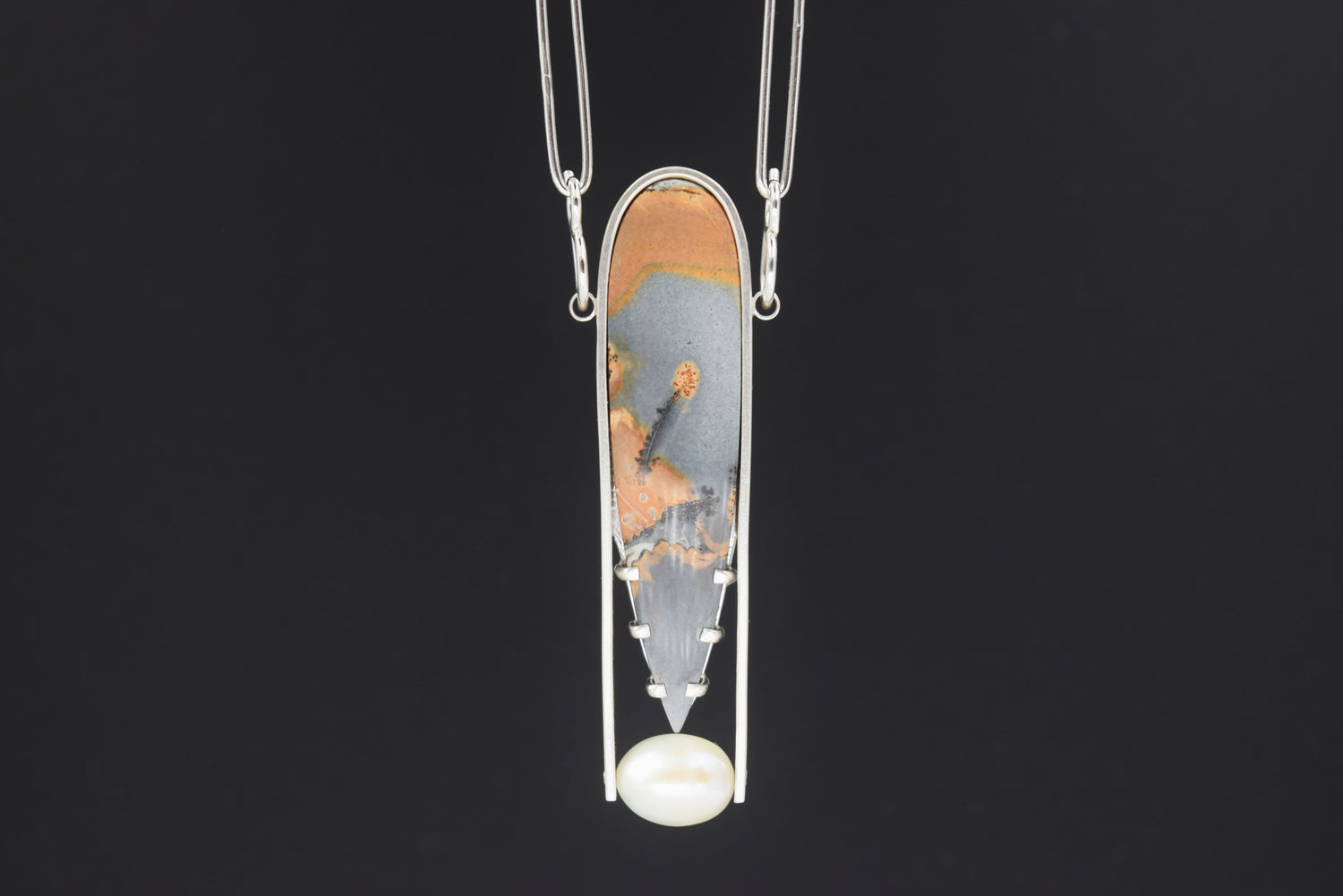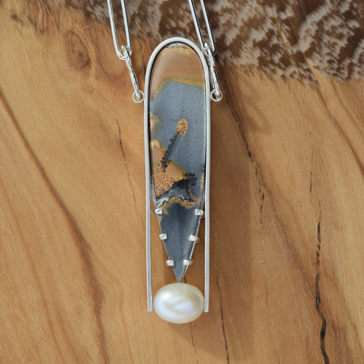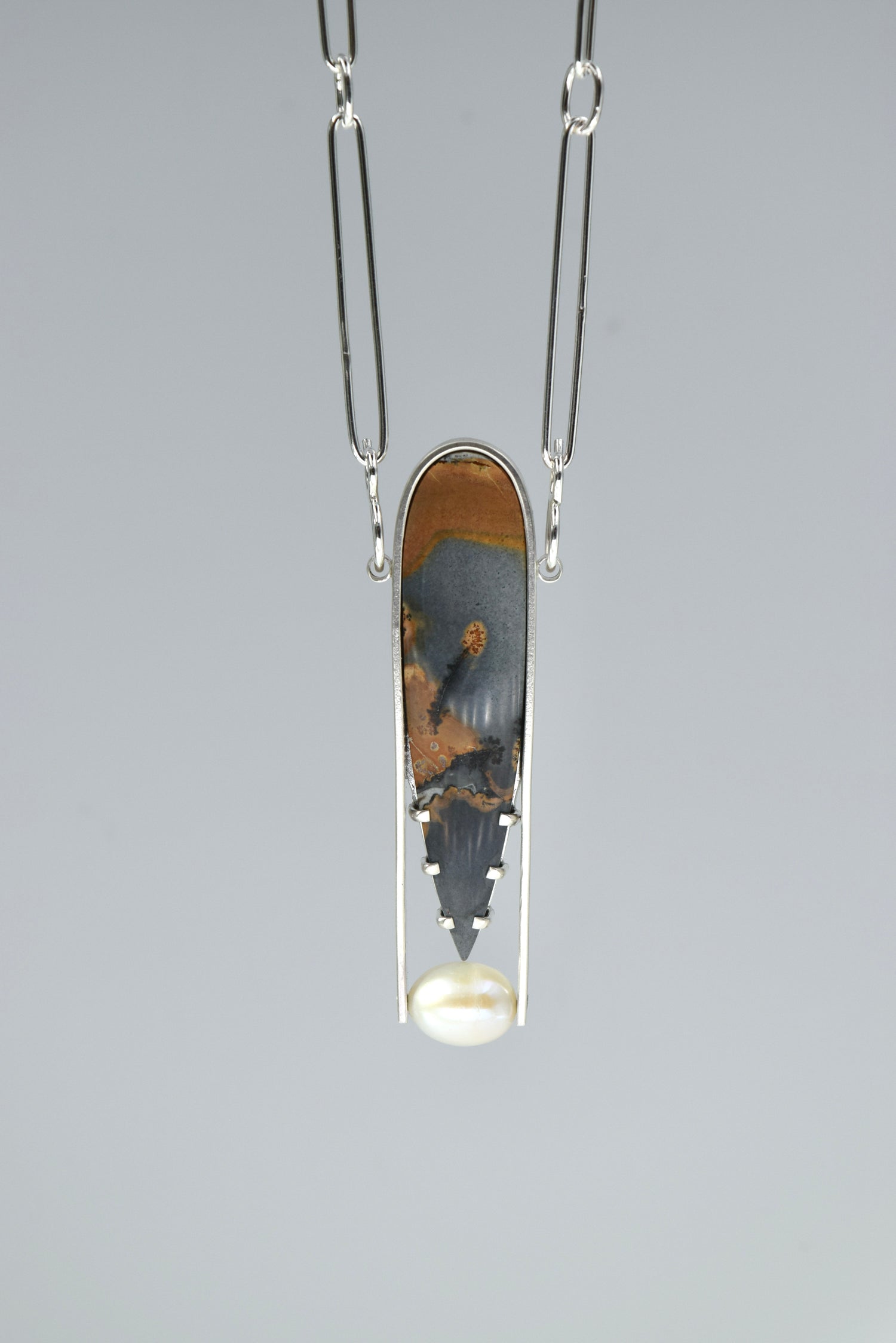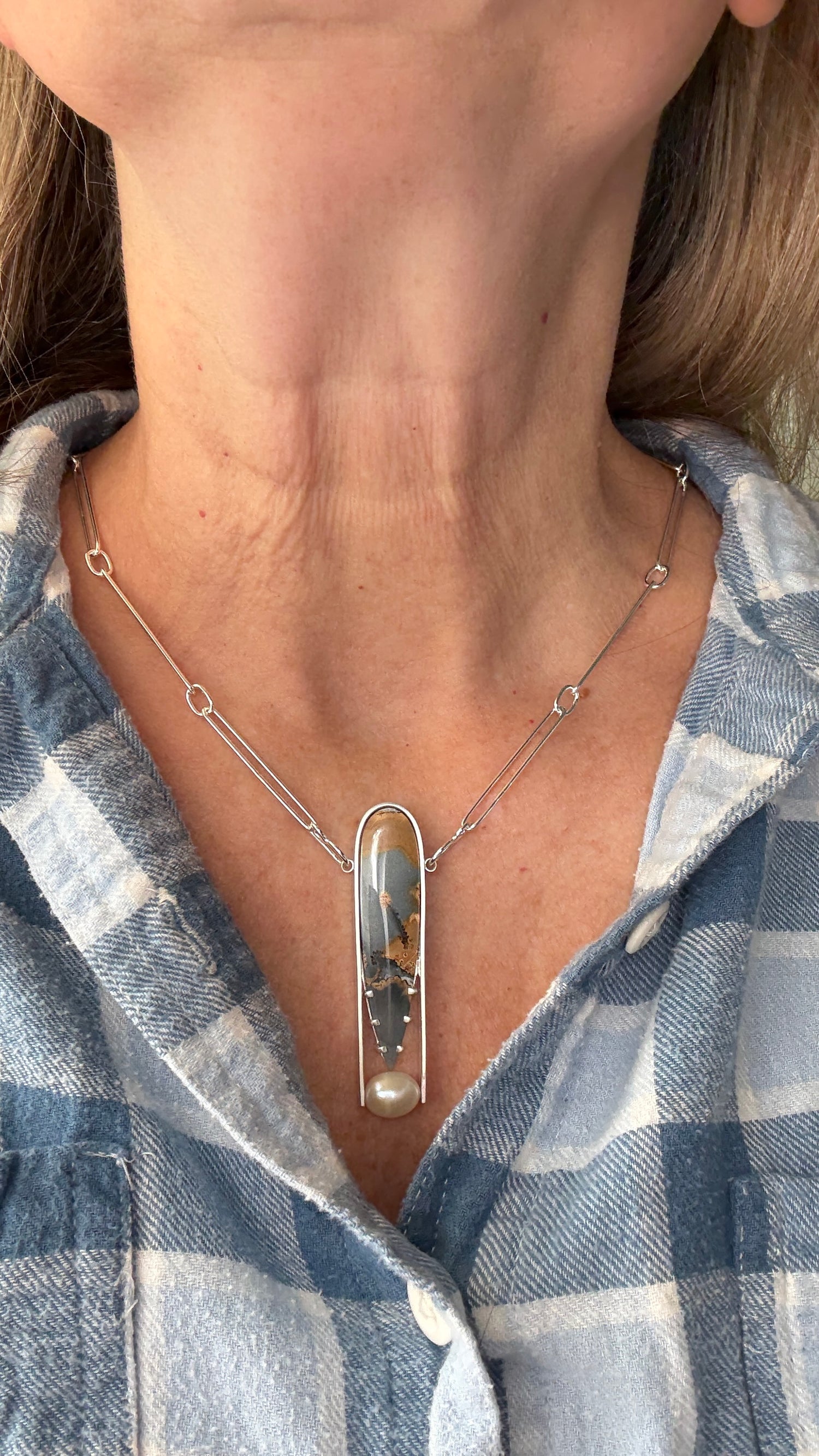 Elevate your style with Close Encounters with Katan Fu - a one-of-a-kind art piece. The whimsical name is inspired by the Japanese word for exclamation point. A beautiful Maligano Jasper & Pearl set is hand-fabricated in a sterling setting, with a stunning deco dust texture on the back. The 16" handmade sterling silver chain features a double front closure for easy wear. Add this 2.75" long and 1" wide pendant to your collection for a touch of uniqueness and elegance.