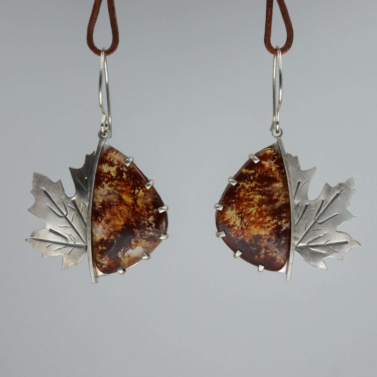 Elevate your fall wardrobe with our one-of-a-kind Fall Maple Earrings. These statement earrings feature hand-fabricated maple leaves crafted from sterling silver and adorned with stunning red moss agate. With a weight of only 6gm each, these 2-inch long and 1.25-inch wide earrings are dynamic. Add a touch of autumn to your outfit with these beautiful and unique earrings.