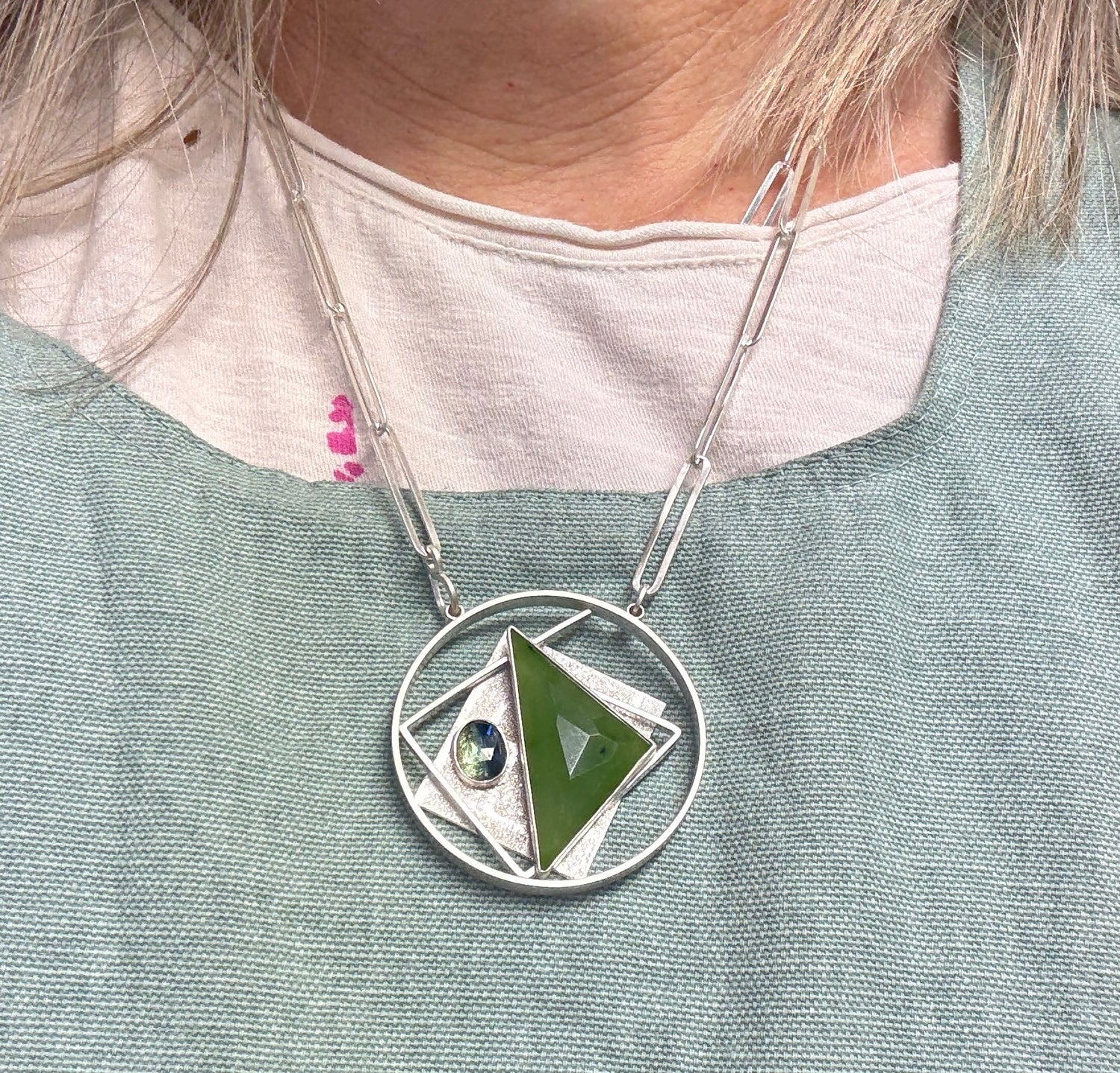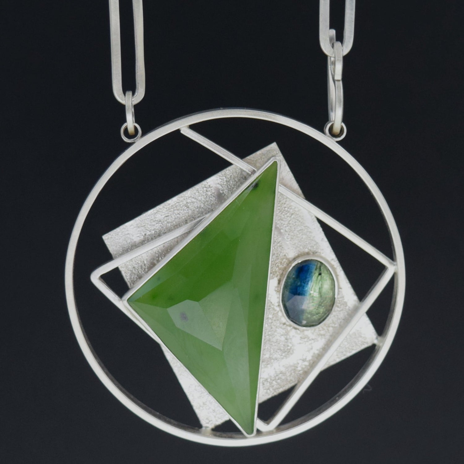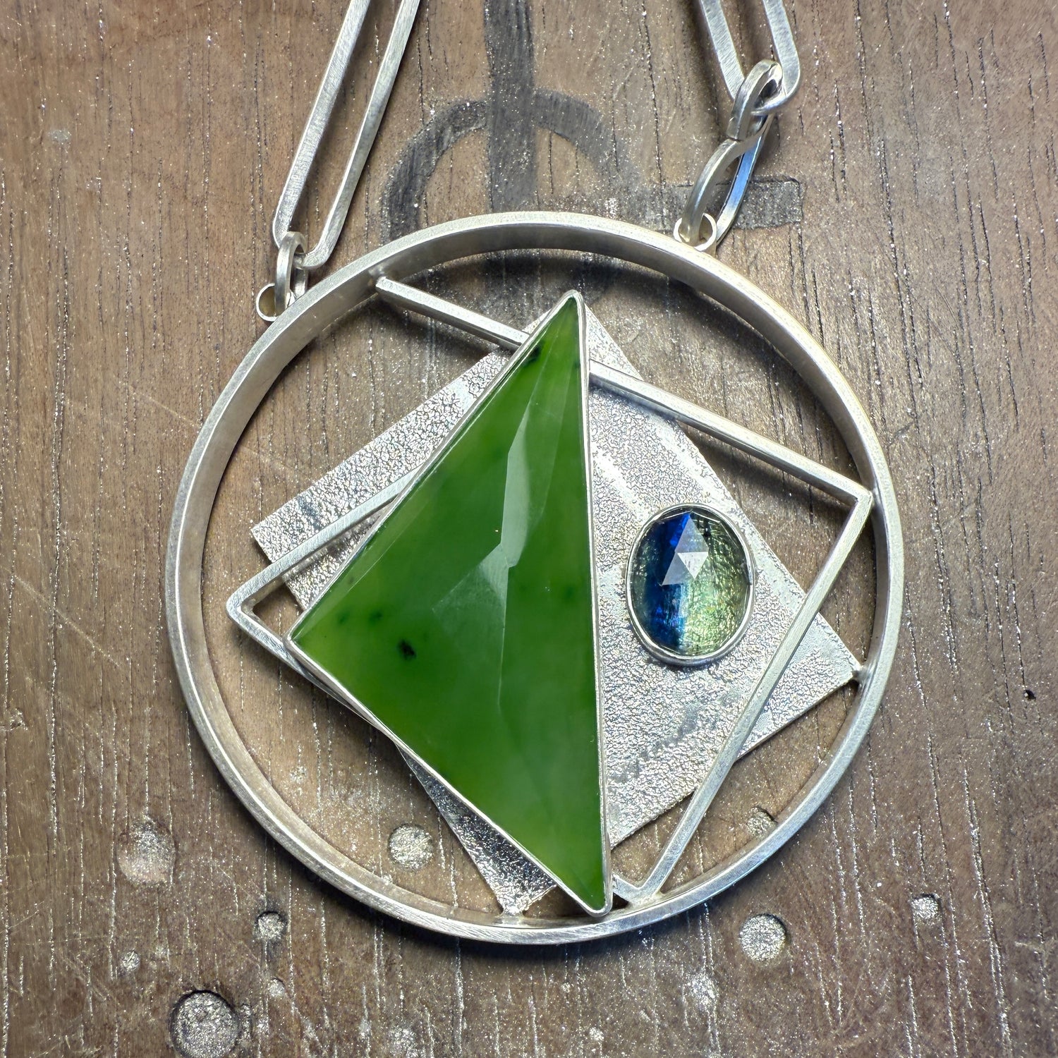 The Fierce Neckpiece features a striking 1.75-inch pendant crafted from large Nephrite jade and blue-green kyanite, showcasing expertly balanced geometric shapes and negative space. Its clean lines create a sophisticated sense of harmony, while the front hook closure attaches seamlessly to an 18-inch large sterling silver paper clip chain. This one-of-a-kind original artwork embodies refined craftsmanship, making it a captivating statement piece for discerning collectors.