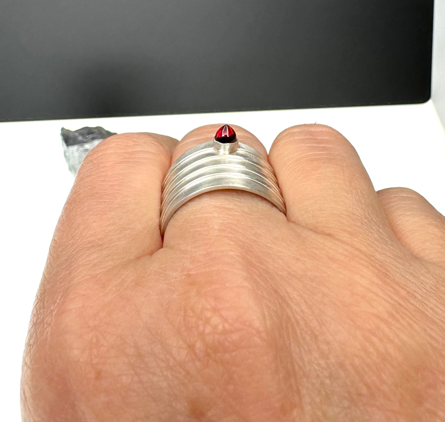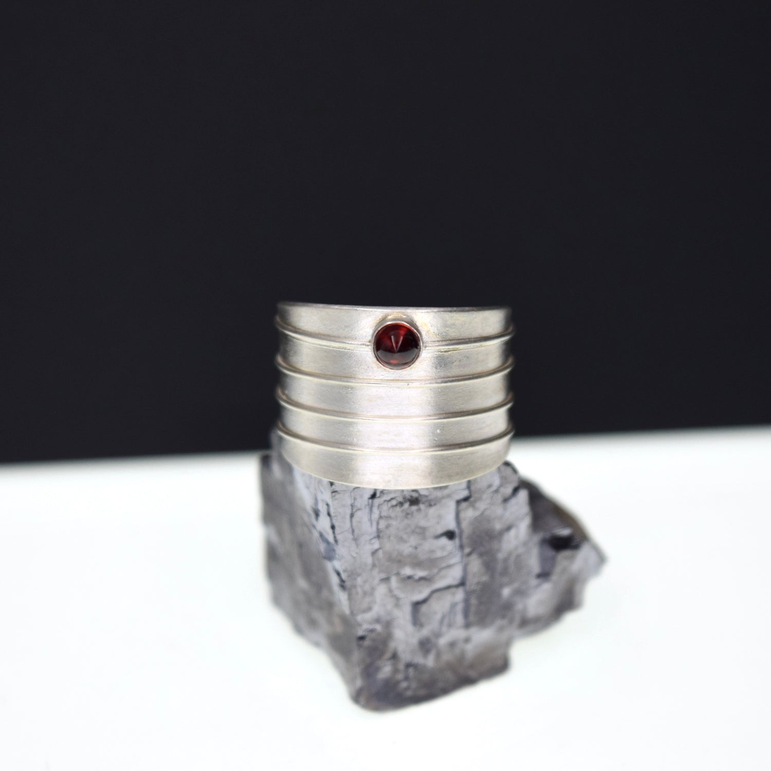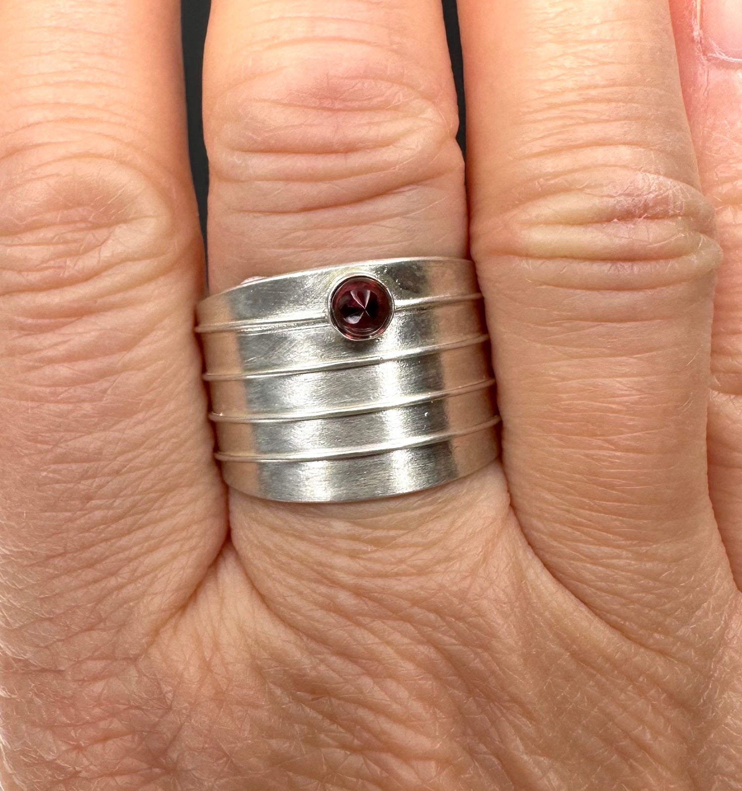 This sterling silver ring features a unique garnet bullet shape and an adjustable band for sizes 7.5-8.5. Add a touch of elegance and versatility to your wardrobe with this beautiful, hand-crafted piece. Perfect for any occasion, this ring is sure to become a staple in your jewelry collection.
