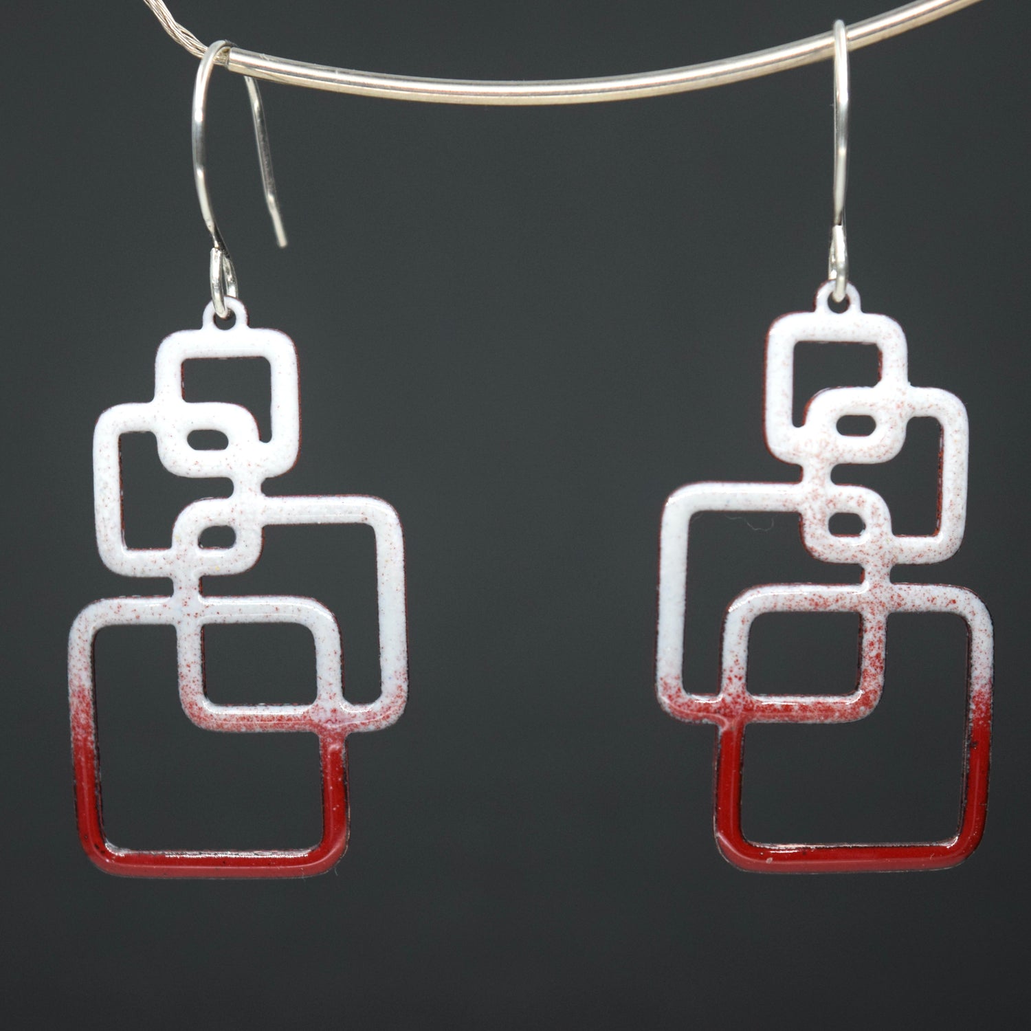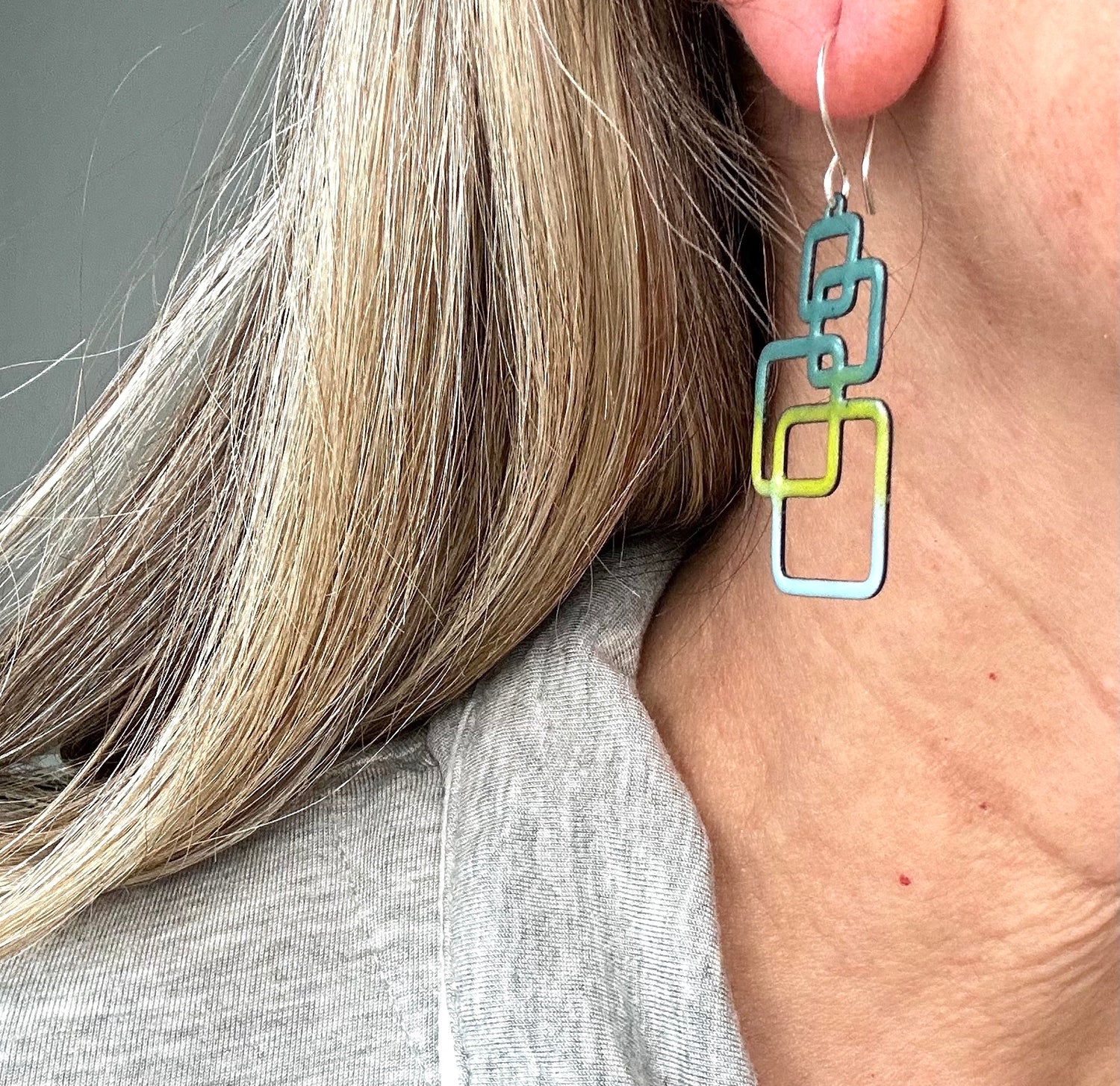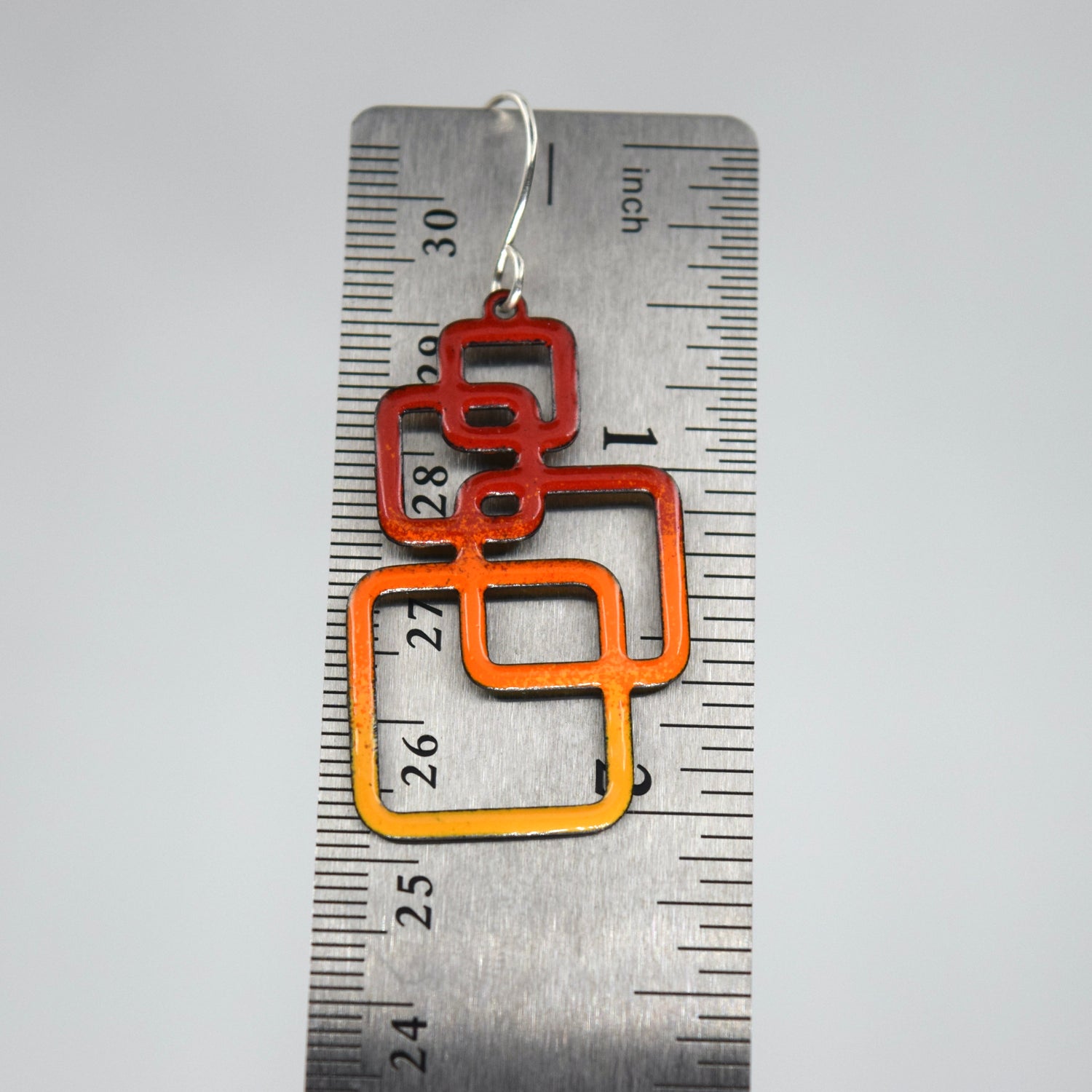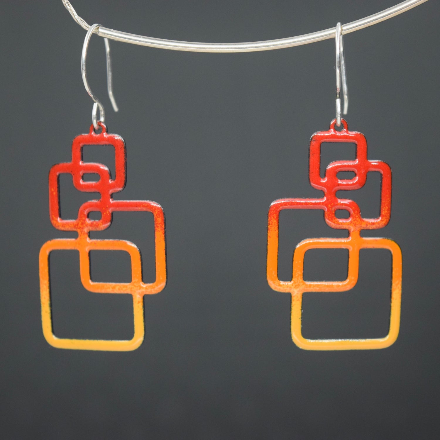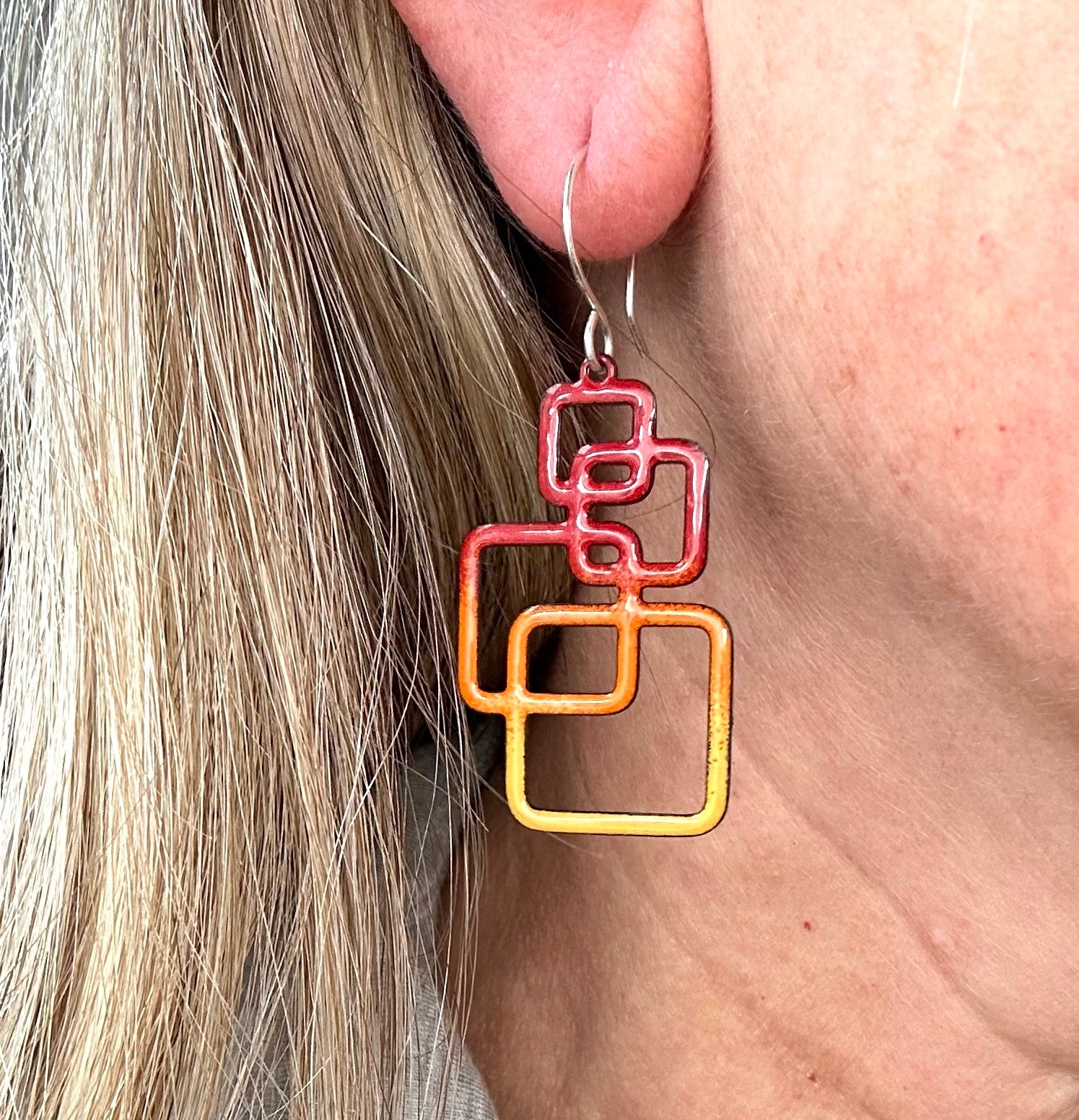 These Geometric Layered Square Enamel Earrings feature playful shapes in vibrant ombre and crackle enamel colors. Made with lightweight materials and sterling silver ear wires, these earrings are a fun and dynamic addition to any outfit. Crafted from enamel on copper, these earrings offer a unique and colorful touch to elevate your look.