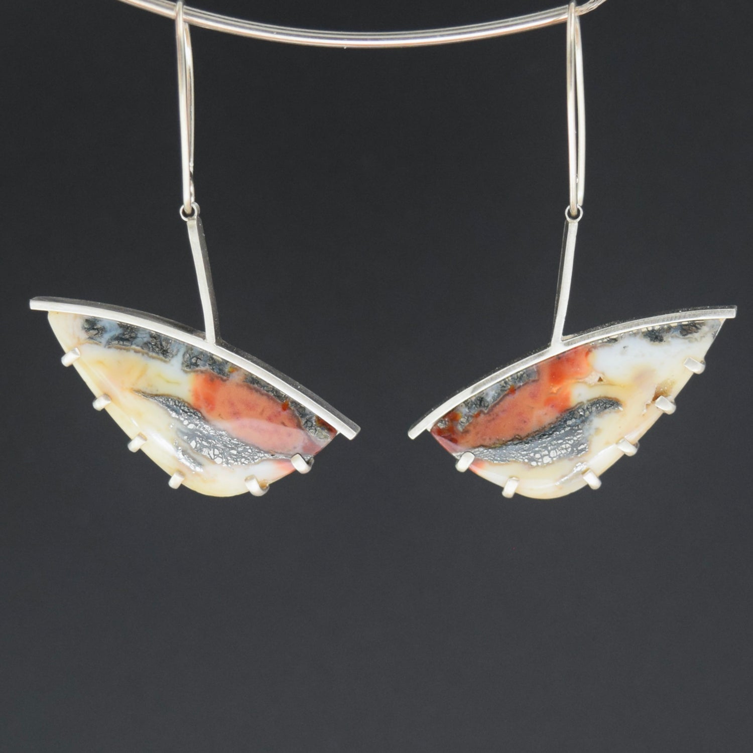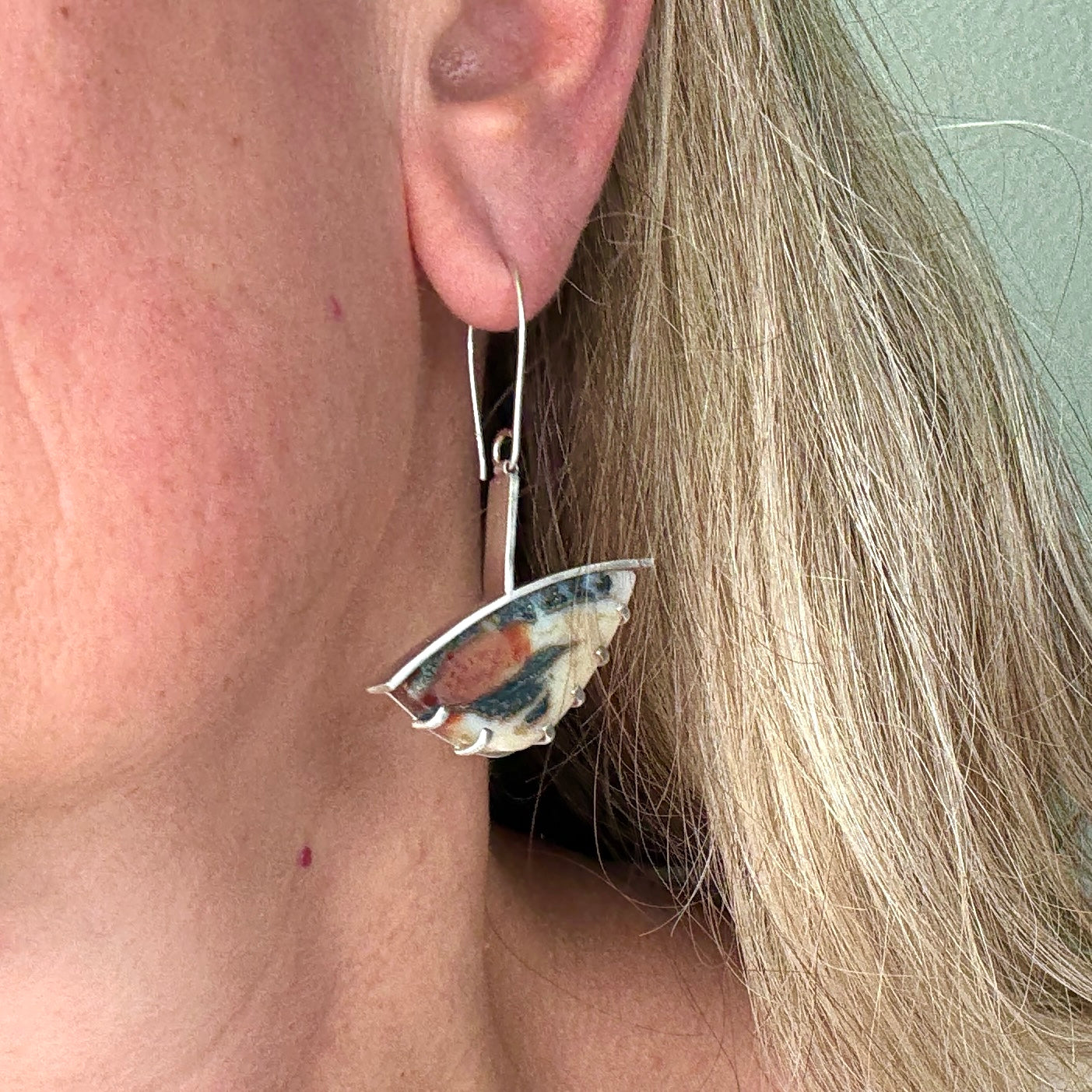 These MEOW Earrings showcase an expert blend of artistry and whimsy with their playful cat-eye shape and angular, unexpected setting. Handmade in sterling silver, they feature signature prongs that hold sparkling marcasite/pyrite stones in white, orange, cream, and gray tones. The unique combination of colors and carefully crafted design gives these earrings a distinctive charm for those seeking both elegance and a touch of fun. approx 2.25" long and weighing about 7gm each