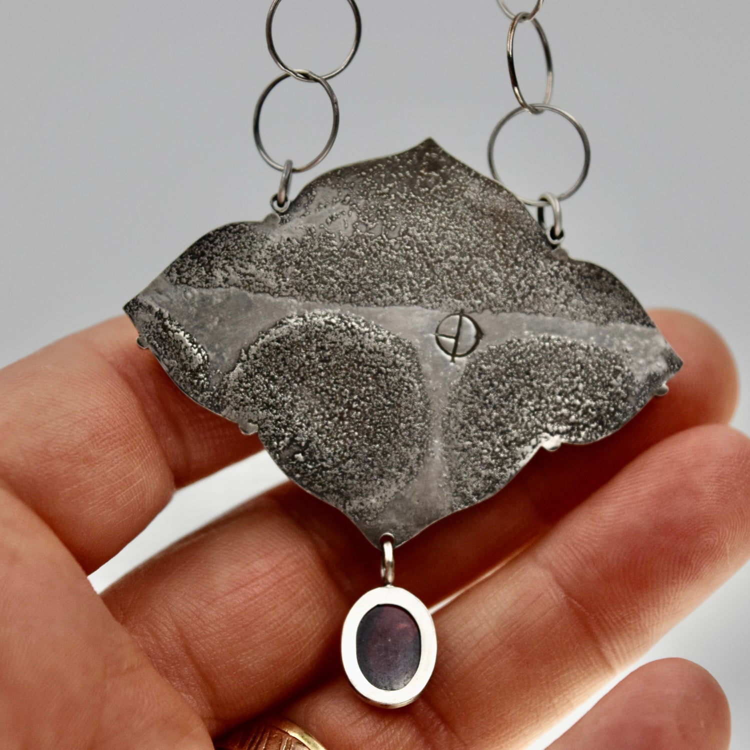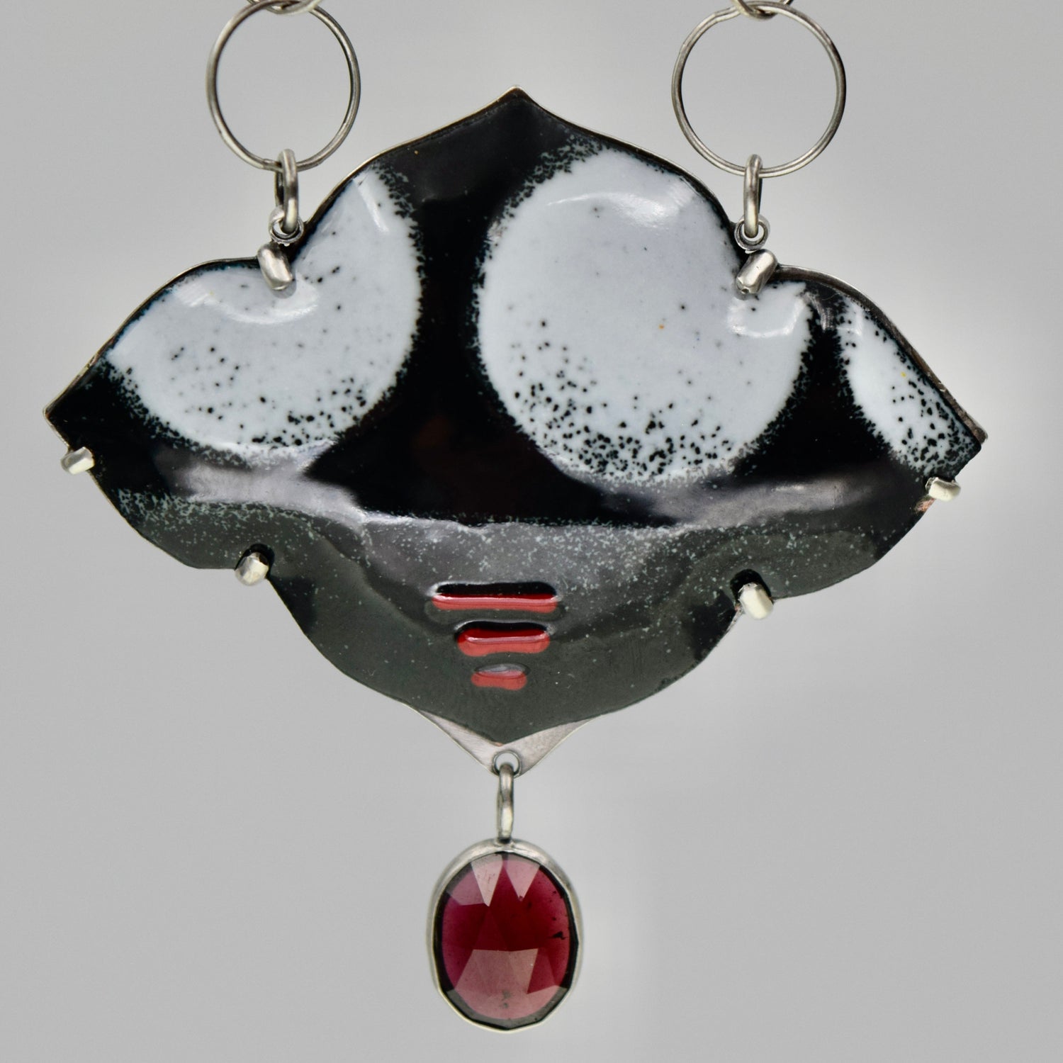 This fun shaped necklace has a 2.75" wide by 1.75" enameled focal piece. Using black, white and red enamel and glass this piece has a fun and interesting design using dramatic colors to define the modern shapes. a 6x8 mm garnet rose cut is set to help add some color and fun movement. This piece in a hand fabricated sterling silver prong setting and has a 18" circle chain in sterling as well. A Shepherds hook as a clasp. I have had feedback that this piece looks like a manta ray but it was simply designed with shapes and no intention to mimic a ray.
