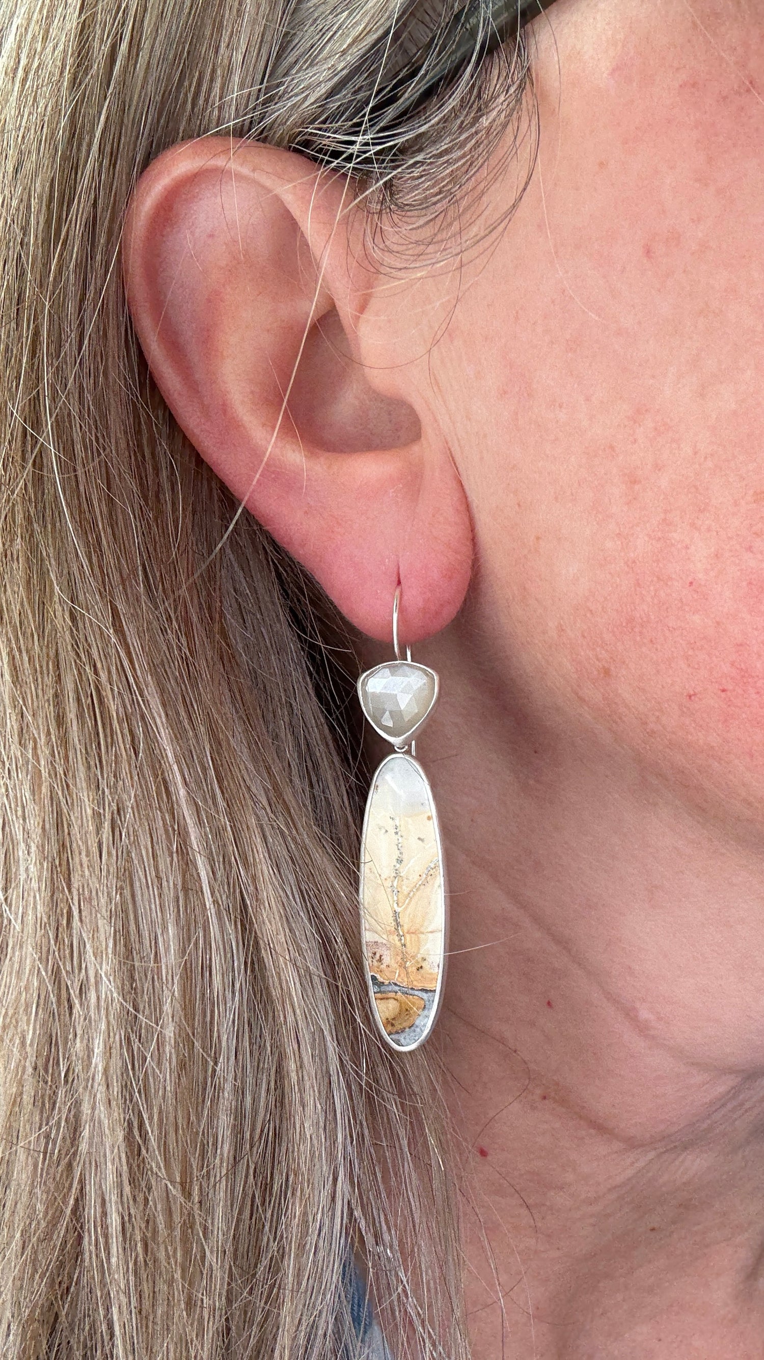 Elevate your everyday style with our one-of-a-kind Mutable Earrings. Featuring Maligano jasper ovals and faceted gray moonstones, framed in sterling silver for a stunning yellow and gray combination. With a secure closed ear wire, these 2" long earrings are perfect for everyday wear. Each earring weighs 7 grams for a comfortable fit. Mutable means, liable to change & isn’t that our whole life’s work❤️