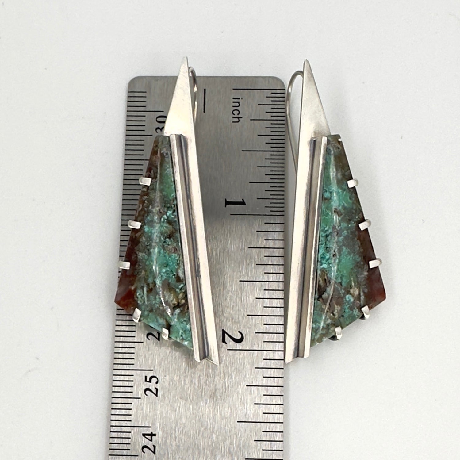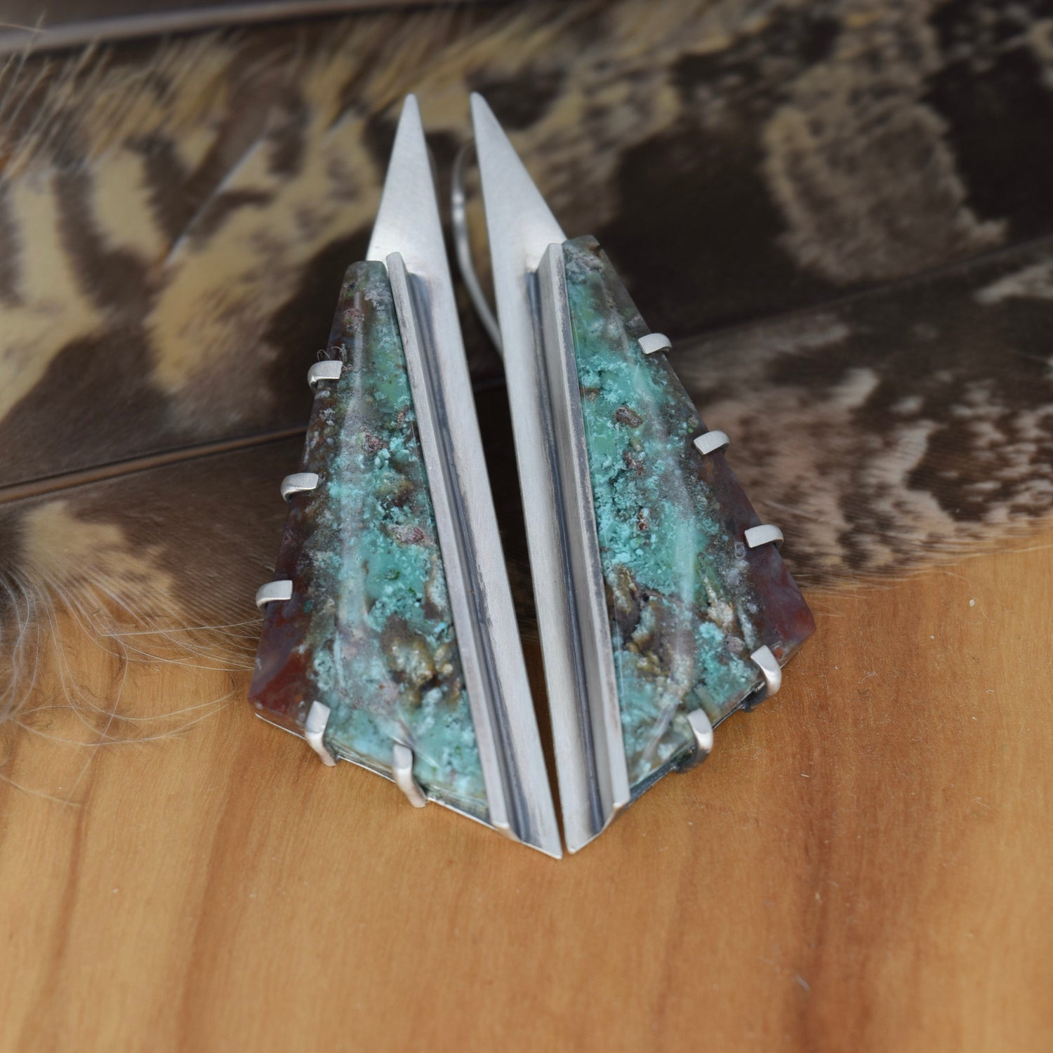 Sterling Silver and opalized wood earrings framed in a really angular and dynamic shape. These are very modern in shape and in size. I love the punk feel of these earrings- dynamic and strong they for sure make a statement. Just over 2 inches in length
