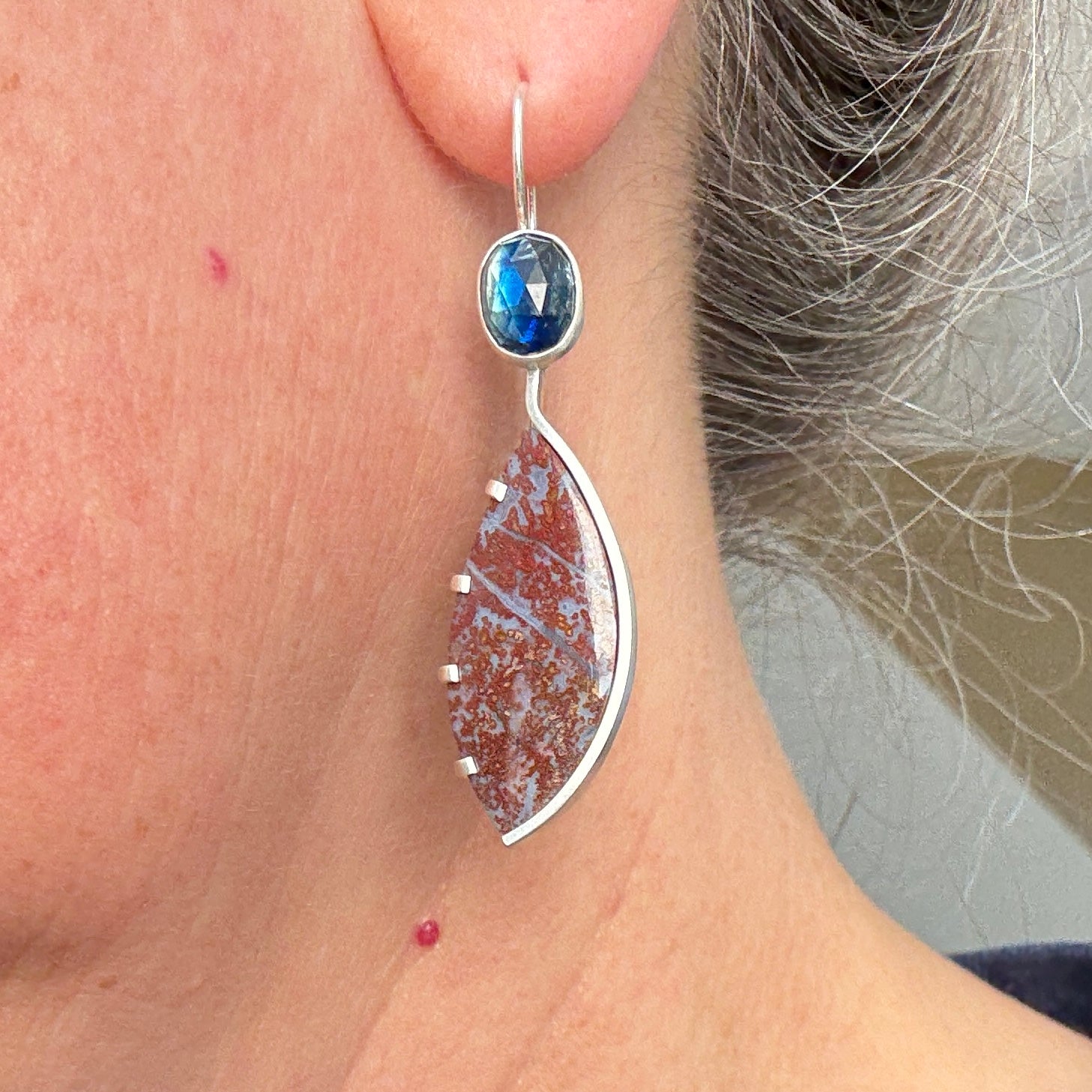 Crafted from sterling silver, blue kyanite, and red agate, these earrings embody the silhouette of a woman pregnant with possibilities. Each piece is hand-fabricated and unique, reflecting expert craftsmanship and thoughtful design. "She Who Speaks Truth to Power" is more than jewelry—it’s a symbol of strength and individuality, perfect for those who value one-of-a-kind artistry.