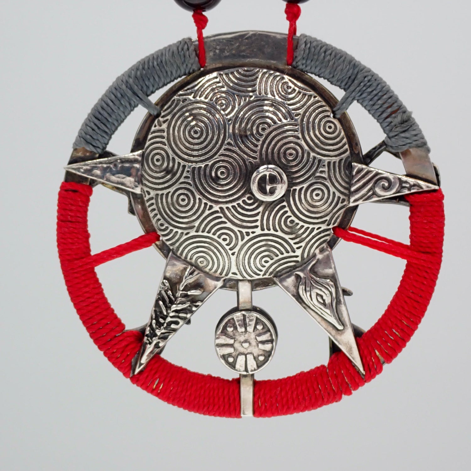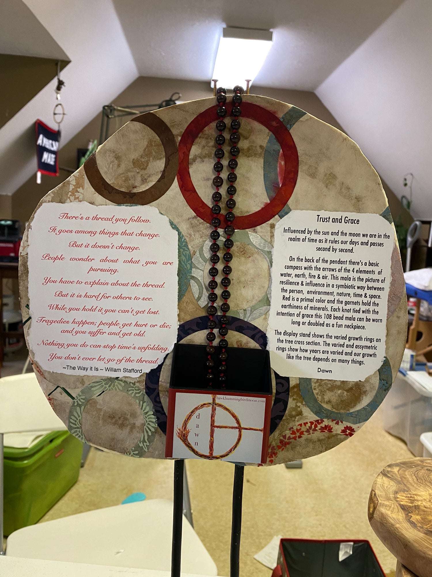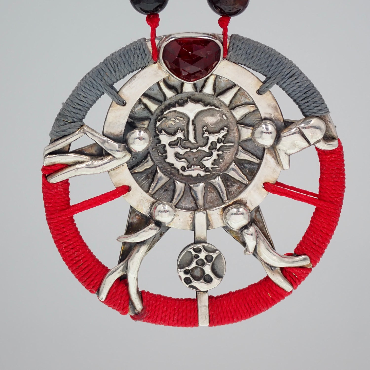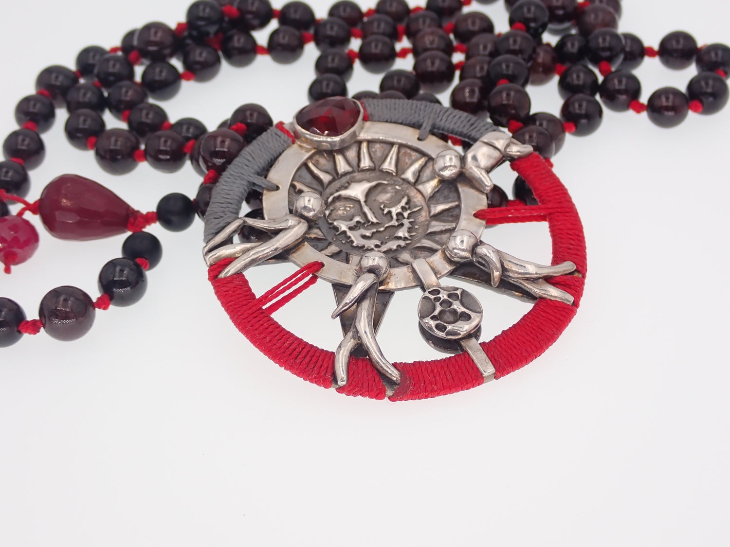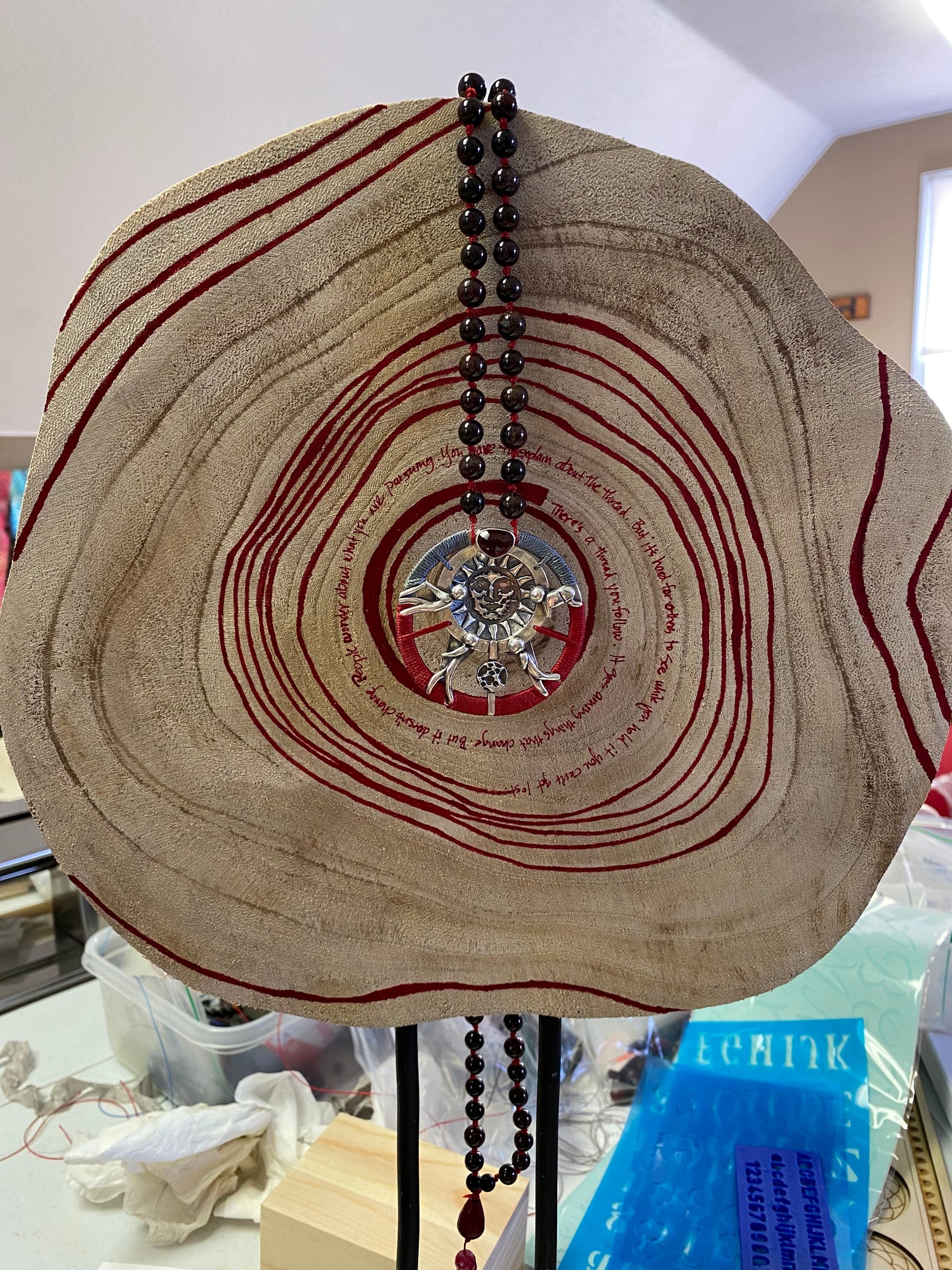 This hand sculpted male is a wearable work of art with an integrated tabletop stand for display. Created with Time as the central aspect you can see the movement on the circular piece from infancy to old age. Circling the sun you can see the moon in the lower aspect of the piece as a grounding to the tides. The back of this pieces has the 4 elements in design- Earth, Air, Water and Fire each had sculpted for this piece to remind us of the impact of these elements in our lives. The thread and weaving are to symbolize destiny and the thread in the poem below. This piece has 108 garnets hand strung along with an end piece of a faceted ruby bead with two small ones dangling below. This is a deeply symbolic piece meant to support you on your journey with time & change. The display piece has part of the poem handwritten in the rings of this cross section which also symbolize time in nature. A true work of art - wearable and sculptural it is 2.75 inches in diameter and can be doubled around the neck to look like 2 layers.